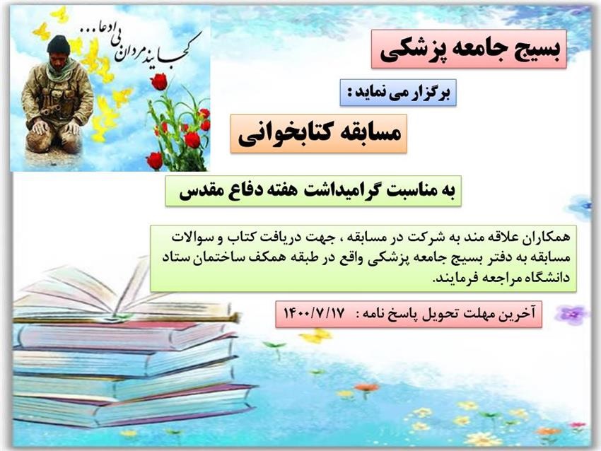 اطلاعیه برگزاری مسابقه کتابخوانی به مناسبت گرامیداشت هفته دفاع مقدس ۲۹ شهریور ۱۴۰۰ | ۱۱:۲۴ کد : ۲۰۲۹۴ اطلاعیه ارسال به دیگران نام شما ایمیل شما ایمیل دریافتکننده ارسال انصراف تعداد بازدید:۲۶۳۸۳
