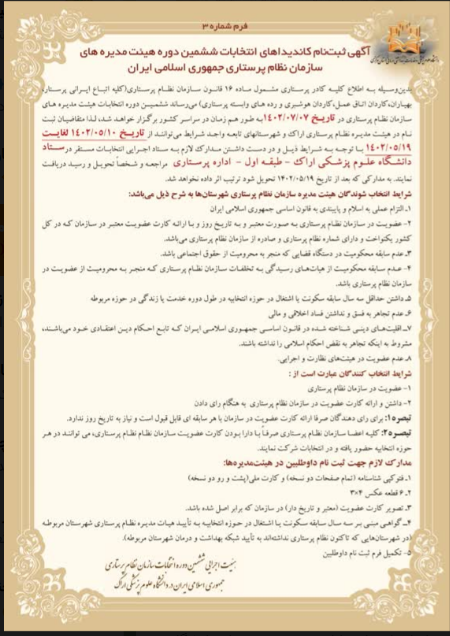 اطلاعیه ثبت نام کاندیداهای انتخابات ششمین دوره هیئت مدیره های سازمان نظام پرستاری ۰۷ مرداد ۱۴۰۲ | ۰۹:۲۲ کد : ۳۶۲۶۴ اطلاعیه ارسال به دیگران نام شما ایمیل شما ایمیل دریافتکننده ارسال انصراف تعداد بازدید:۱۵۷۶۲