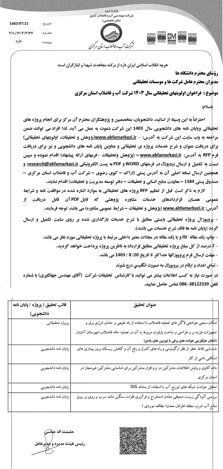 فراخوان اولویتهای تحقیقاتی شرکت آب و فاضلاب استان ۲۲ مهر ۱۴۰۳ | ۱۰:۳۵ کد : ۴۶۷۳۴ اطلاعیه ارسال به دیگران نام شما ایمیل شما ایمیل دریافتکننده ارسال انصراف تعداد بازدید:۱۰۵۴۹ فراخوان اولویتهای تحقیقاتی سال ۱۴۰۳ شرکت آب و فاضلاب استان مرکزی