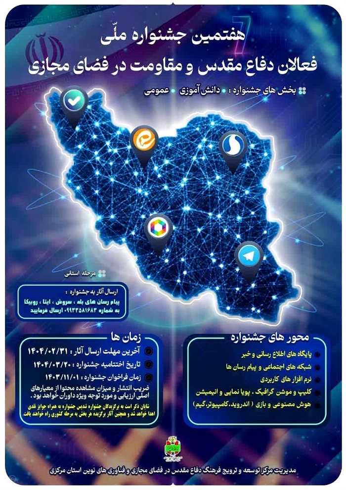 اداره کل حفظ آثار و نشر ارزش های دفاع مقدس استان مرکزی ،هفتمین دوره جشنواره ملی فعالان دفاع مقدس و مقاومت در فضای مجازی را برگزار می نماید.