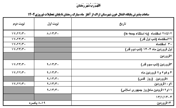 اعلام ساعات پذیرش اهدا کنندگان محترم در پایگاه انتقال خون شهرستان در ماه مبارک رمضان ۲۸ اسفند ۱۴۰۳ | ۱۳:۰۸ کد : ۵۰۲۶۹ اطلاعیه ارسال به دیگران نام شما ایمیل شما ایمیل دریافتکننده ارسال انصراف تعداد بازدید:۶۶۸۹ اعلام ساعات پذیرش اهدا کنندگان محترم در پایگاه انتقال خون شهرستان در ماه مبارک رمضان