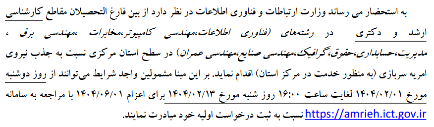 چهارمین مرحله جذب نیروی امریه سربازی در وزارت ارتباطات و فناوری اطلاعات ۲۷ فروردین ۱۴۰۴ | ۱۵:۱۱ کد : ۵۰۸۰۸ اطلاعیه ارسال به دیگران نام شما ایمیل شما ایمیل دریافتکننده ارسال انصراف تعداد بازدید:۳۶۶۴ فراخوان چهارمین مرحله جذب نیروی امریه سربازی در وزارت ارتباطات و فناوری اطلاعات