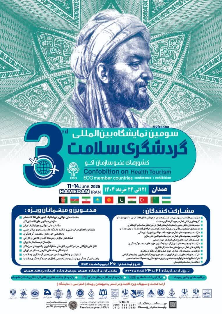 به اطلاع می رساند استان همدان از تاریخ ۲۱ لغایت ۲۴ خردادماه میزبان سومین کنفوبیشن (کنفرانس + نمایشگاه) بین المللی گردشگری سلامت کشورهای عضو سازمان اکو می باشد و از هر کشور عضو اکو، هیئتی مشتمل بر عالی ترین مقامات درمان و سلامت + گردشگری، فعالان بلند پایه پزشکی و گردشگری، مدیران تشکل های گردشگری و درمان و گروههای بخش خصوصی تجاری و اقتصادی و همچنین سفیر هر کشور مستقر در تهران همراه با رایزن اقتصادی سفارت، میزبان این رویداد می باشند. برگزاری با شکوه و حضور پرشور مجموعه های فعال در حوزه های متنوع گردشگری سلامت سراسر کشور در این رویداد بین المللی، ضمن معرفی ظرفیت ها و توانمندی های تخصصی حوزه های گردشگری سلامت و تندرستی همه استان های کشور، زمینه تبادلات تجاری و اقتصادی اعم از صادرات، جذب سرمایه گذاری و ارز آوری خواهد بود.