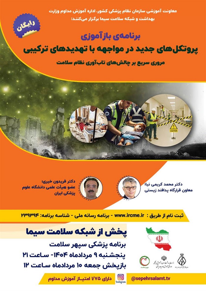 به اطلاع کلیه گروه های پزشکی، دندان پزشکی، داروسازی و تمامی رشته های پیراپزشکی می رساند، معاونت آموزشی و پژوهشی سازمان نظام پزشکی و ادراه آموزش مداوم وزارت بهداشت، با توجه به ضرورت ارتقاء آمادگی و تاب آوری جامعه پزشکی در مواجهه با تهدیدات نوین و ترکیبی، در راستای روزآمدسازی دانش حرفه ای اعضا و با هدف آگاهی بخشی تخصصی، برنامه بازآموزی تلویزیونی با عنوان "پروتکل های جدید مواجهه با تهدیدهای ترکیبی" را با محوریت مروری سریع بر چالش های تاب آوری نظام سلامت، برگزار می نمایند.