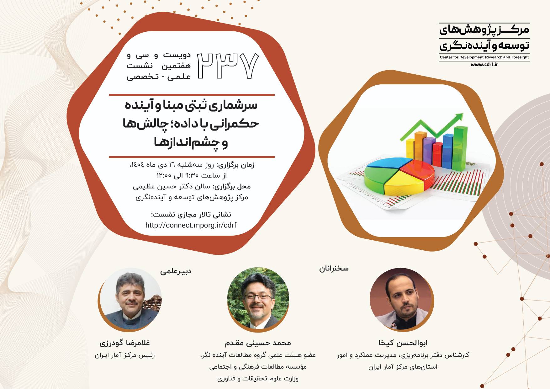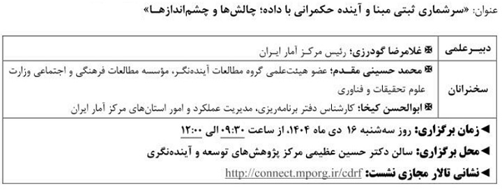 نشست علمی سرشماری ثبتی مبنا آینده حکمرانی با داده ۱۴ دی ۱۴۰۴ | ۱۰:۲۱ کد : ۵۷۴۱۸ اطلاعیه ارسال به دیگران نام شما ایمیل شما ایمیل دریافتکننده ارسال انصراف تعداد بازدید:۹۱۵ دویست وسی وهفتمین نشست علمی - تخصصی با عنوان سرشماری ثبتی مبنا آینده حکمرانی با داده، چالش ها وچشم اندازها
