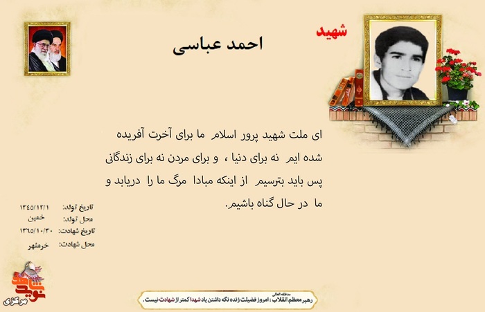 فرازی از وصیت نامه شهدا ۱۳ دی ۱۴۰۴ | ۱۰:۰۱ کد : ۵۷۴۶۹ اطلاعیه ارسال به دیگران نام شما ایمیل شما ایمیل دریافتکننده ارسال انصراف تعداد بازدید:۵۲۶ فرازی از وصیت نامه شهدا فرازی از وصیت نامه شهید بزرگوار احمد عباسی :