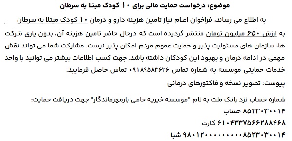 درخواست حمایت مالی، برای ۱۰ کودک مبتلا به سرطان ۰۷ بهمن ۱۴۰۴ | ۱۱:۳۳ کد : ۵۷۷۳۲ اطلاعیه ارسال به دیگران نام شما ایمیل شما ایمیل دریافتکننده ارسال انصراف تعداد بازدید:۵۸۷ موسسه خیریه حامی یار، درخواست حمایت مالی، برای ۱۰ کودک مبتلا به سرطان را دارد.
